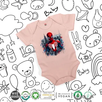 Spiderman City, Βρεφικό φορμάκι μωρού, 0-18 μηνών, ΡΟΖ POWDER, 100% Organic Cotton, κοντομάνικο