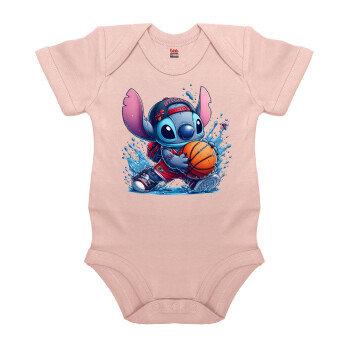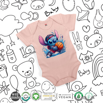 Stitch Basketball, Βρεφικό φορμάκι μωρού, 0-18 μηνών, ΡΟΖ POWDER, 100% Organic Cotton, κοντομάνικο