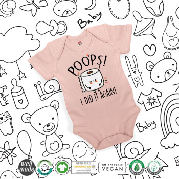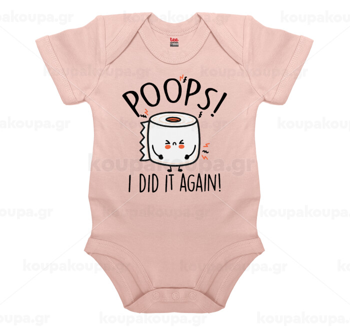 Poops!...I Did It Again, Βρεφικό φορμάκι μωρού, 0-18 μηνών, ΡΟΖ POWDER, 100% Organic Cotton, κοντομάνικο