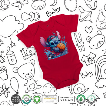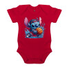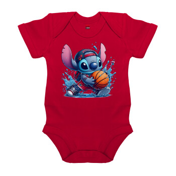 Stitch Basketball, Βρεφικό φορμάκι μωρού, ΚΟΚΚΙΝΟ, 100% Organic Cotton, κοντομάνικο
