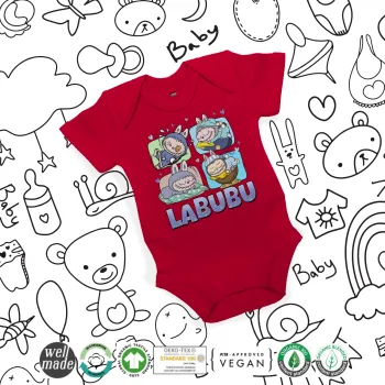 Labubu, Βρεφικό φορμάκι μωρού, ΚΟΚΚΙΝΟ, 100% Organic Cotton, κοντομάνικο