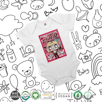 Harley Quinn (Χάρλεϊ Κουίν), Βρεφικό φορμάκι μωρού, 0-24 μηνών, ΛΕΥΚΟ, 100% Organic Cotton, κοντομάνικο