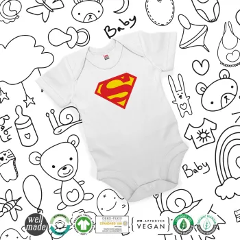 Superman, Βρεφικό φορμάκι μωρού, 0-24 μηνών, ΛΕΥΚΟ, 100% Organic Cotton, κοντομάνικο