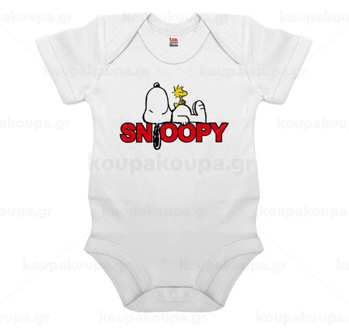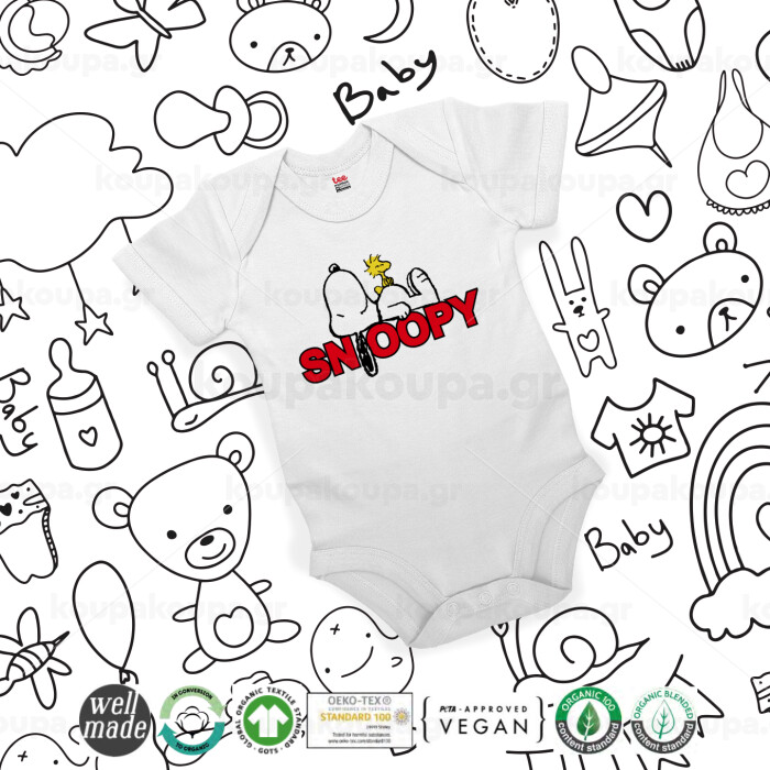 Snoopy sleep, Βρεφικό φορμάκι μωρού, 0-24 μηνών, ΛΕΥΚΟ, 100% Organic Cotton, κοντομάνικο