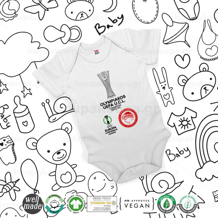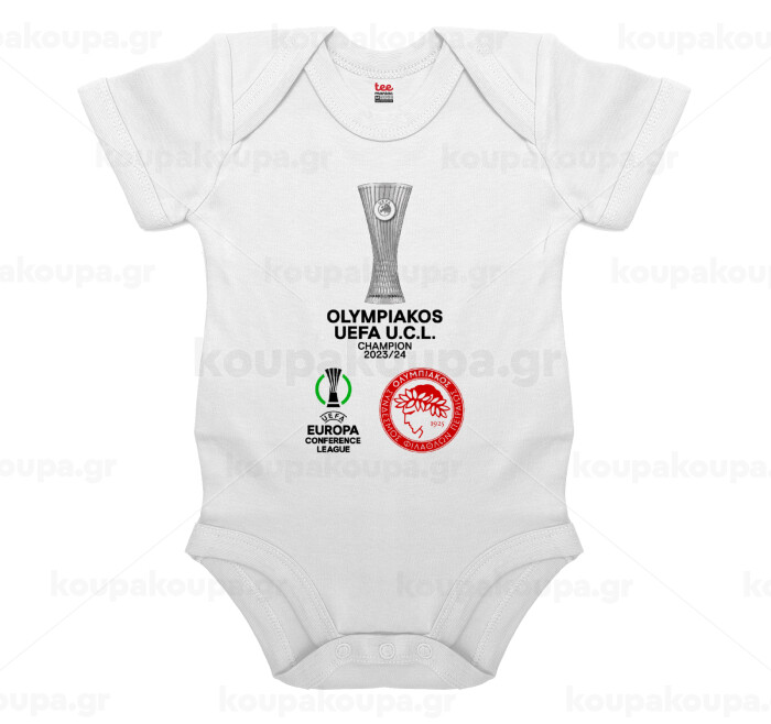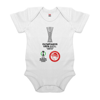 Olympiacos UEFA Europa Conference League Champion 2023/24, Βρεφικό φορμάκι μωρού, 0-24 μηνών, ΛΕΥΚΟ, 100% Organic Cotton, κοντομάνικο