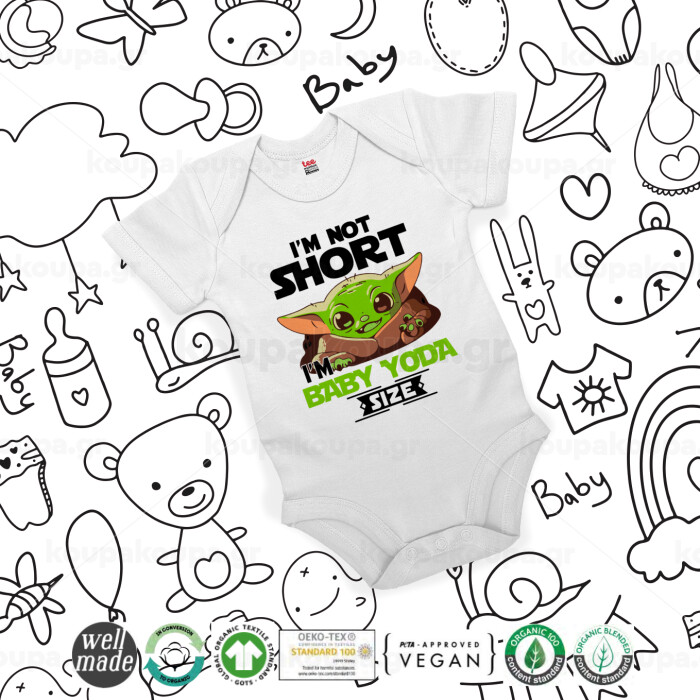 I'm not short, i'm Baby Yoda size, Βρεφικό φορμάκι μωρού, 0-24 μηνών, ΛΕΥΚΟ, 100% Organic Cotton, κοντομάνικο