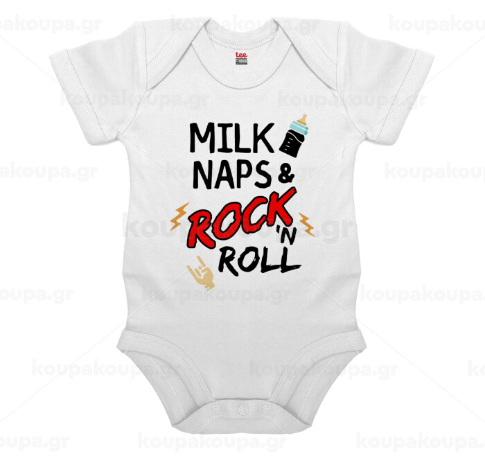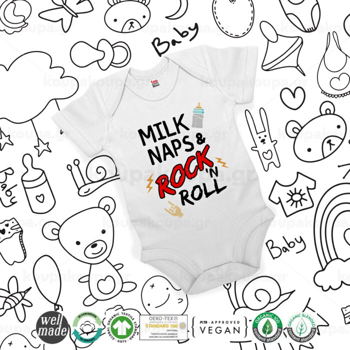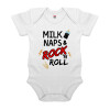 milk naps and Rock n' Roll, Βρεφικό φορμάκι μωρού, 0-24 μηνών, ΛΕΥΚΟ, 100% Organic Cotton, κοντομάνικο