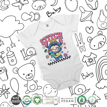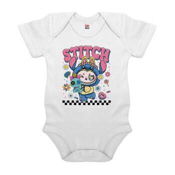 Labubu Stitch, Βρεφικό φορμάκι μωρού, 0-24 μηνών, ΛΕΥΚΟ, 100% Organic Cotton, κοντομάνικο