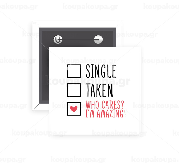 Single, Taken, Who cares i'm amazing, Κονκάρδα παραμάνα τετράγωνη 5x5cm