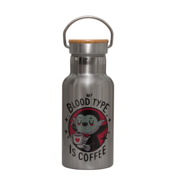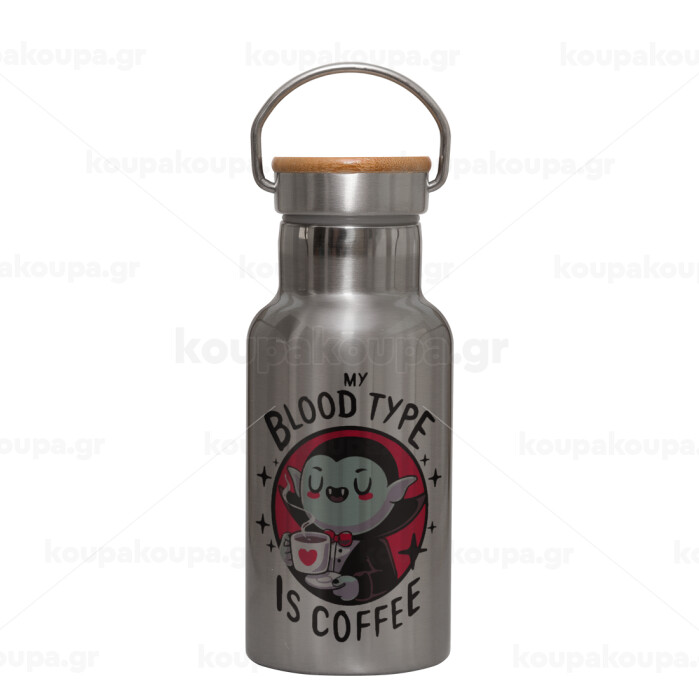 My blood type is coffee, Stainless steel metallic thermos flask, silver with a bamboo lid, double-walled, 350ml.