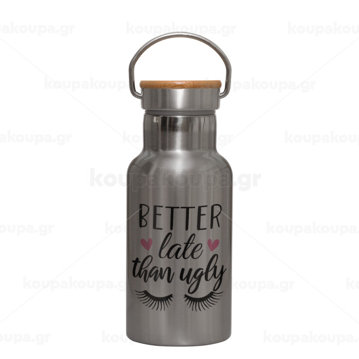 Better Late than ugly hearts, Stainless steel metallic thermos flask, silver with a bamboo lid, double-walled, 350ml.
