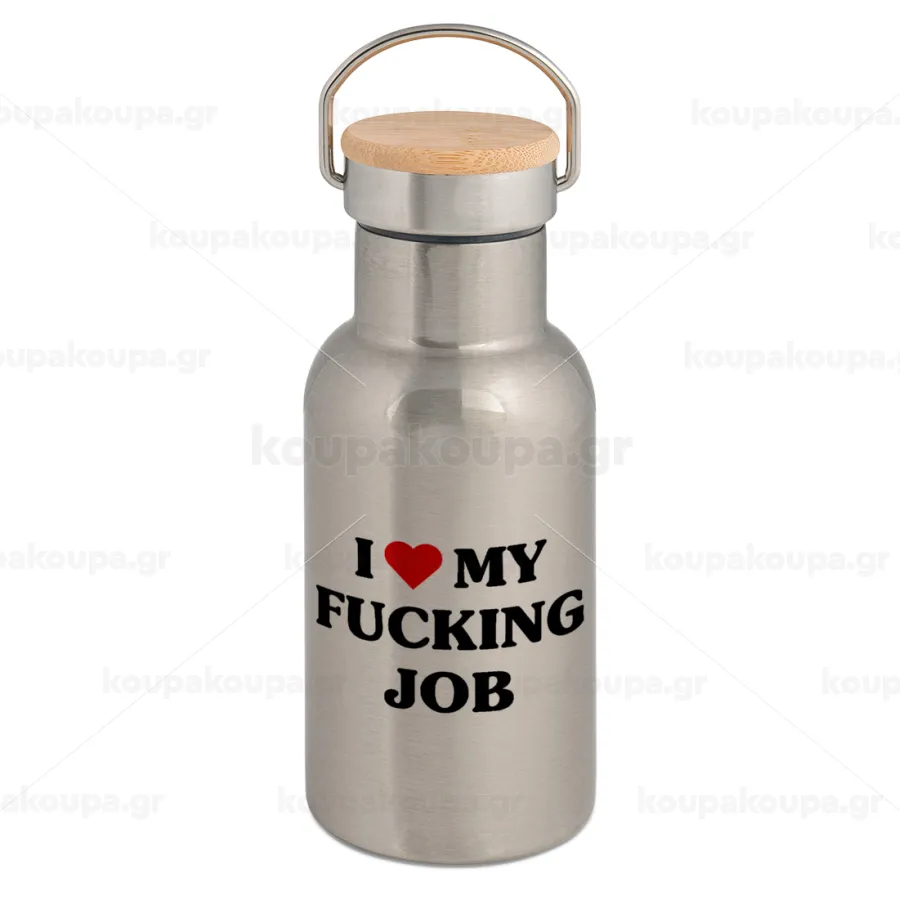 I love my fucking job, Stainless steel metallic thermos flask, silver with a bamboo lid, double-walled, 350ml.
