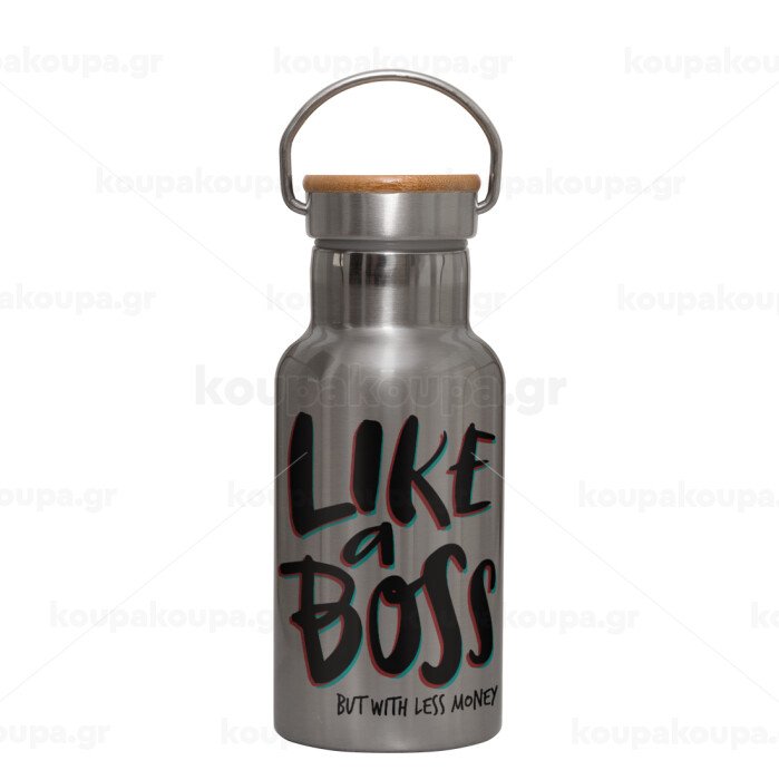 Like a boss, but with less money!!!, Stainless steel metallic thermos flask, silver with a bamboo lid, double-walled, 350ml.
