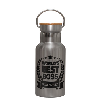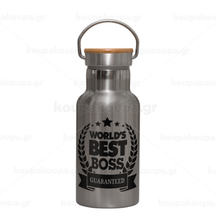 World's best boss stars, Stainless steel metallic thermos flask, silver with a bamboo lid, double-walled, 350ml.