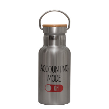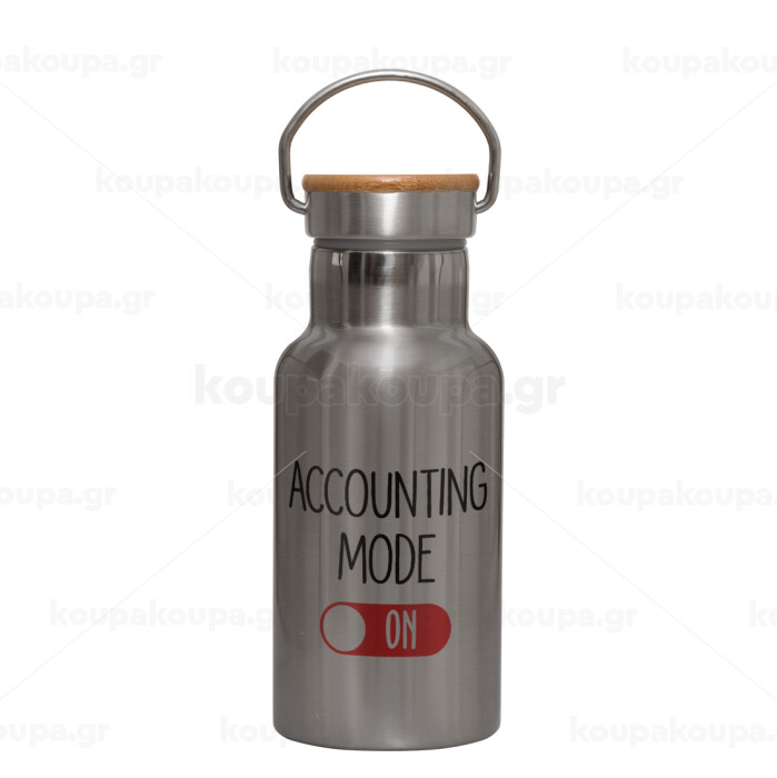 ACCOUNTANT MODE ON, Stainless steel metallic thermos flask, silver with a bamboo lid, double-walled, 350ml.