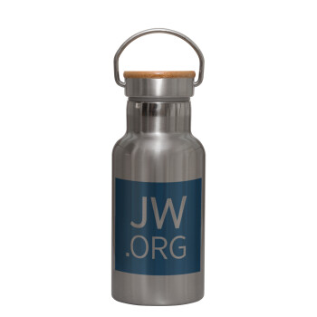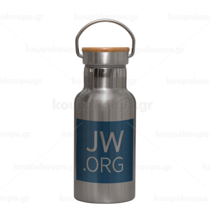 JW.ORG, Stainless steel metallic thermos flask, silver with a bamboo lid, double-walled, 350ml.