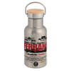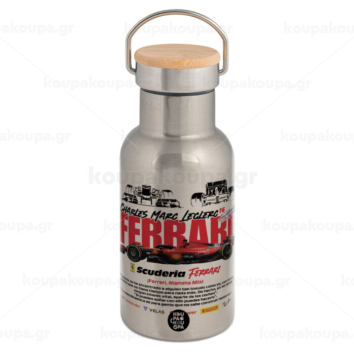 F1 Ferrari, Stainless steel metallic thermos flask, silver with a bamboo lid, double-walled, 350ml.