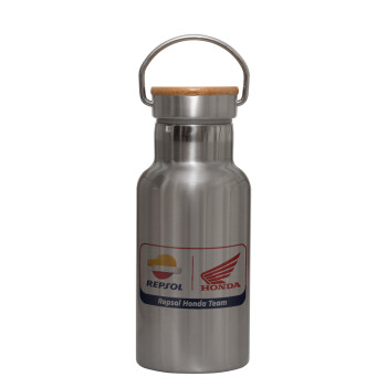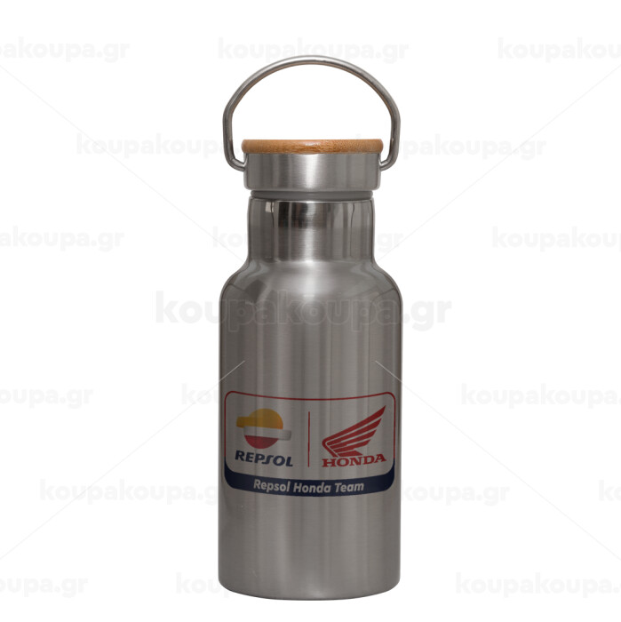 Honda Repsol Team, Stainless steel metallic thermos flask, silver with a bamboo lid, double-walled, 350ml.