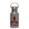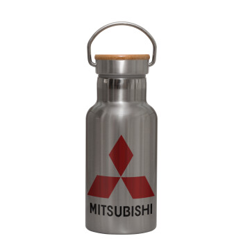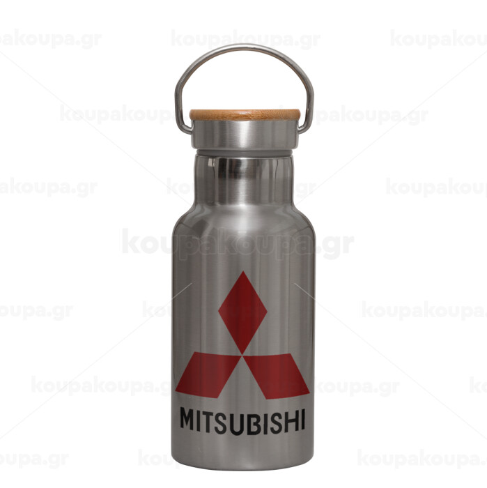 mitsubishi, Stainless steel metallic thermos flask, silver with a bamboo lid, double-walled, 350ml.