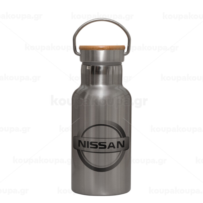 nissan, Stainless steel metallic thermos flask, silver with a bamboo lid, double-walled, 350ml.