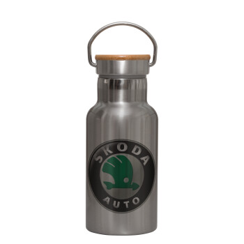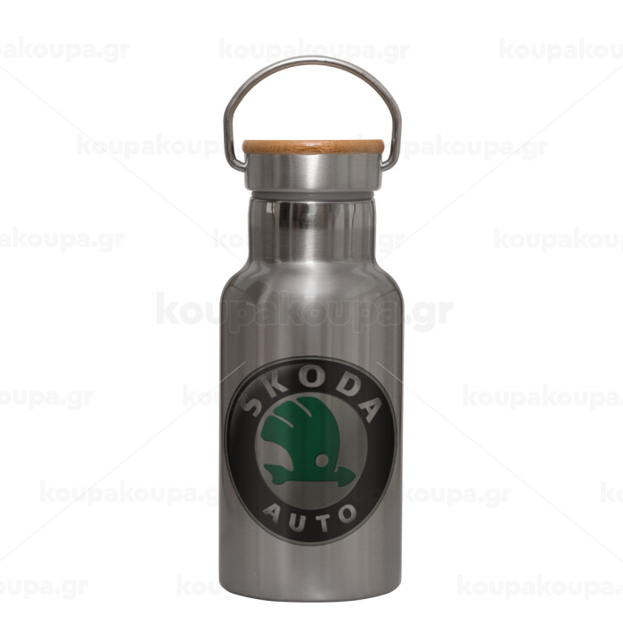 SKODA, Stainless steel metallic thermos flask, silver with a bamboo lid, double-walled, 350ml.