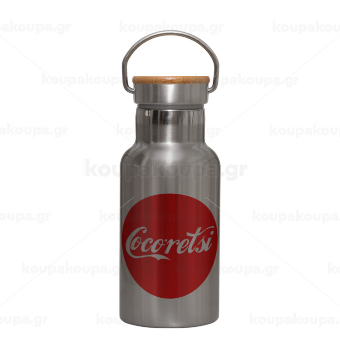 Cocoretsi, Stainless steel metallic thermos flask, silver with a bamboo lid, double-walled, 350ml.