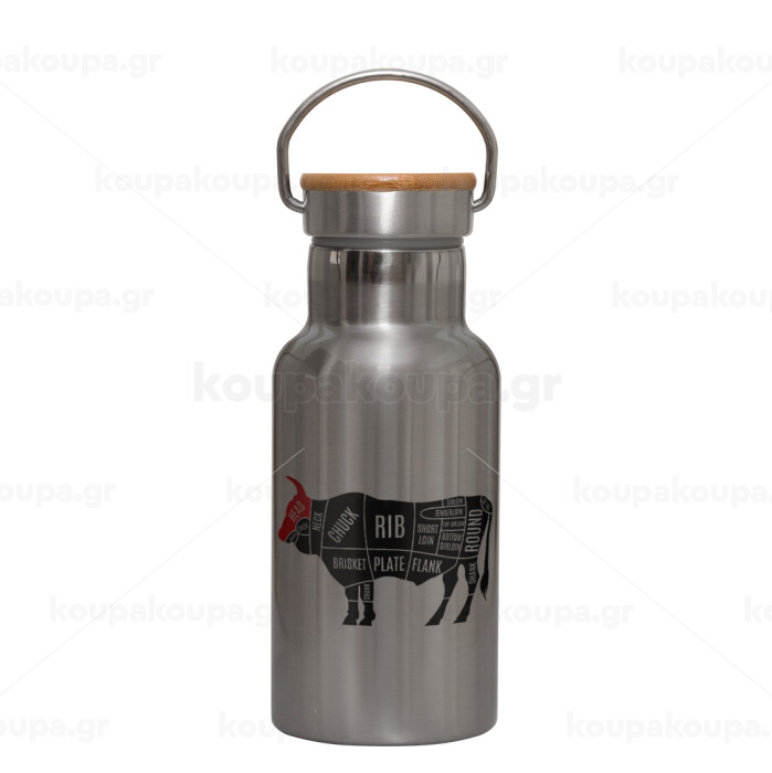 Diagrams for butcher shop, Stainless steel metallic thermos flask, silver with a bamboo lid, double-walled, 350ml.