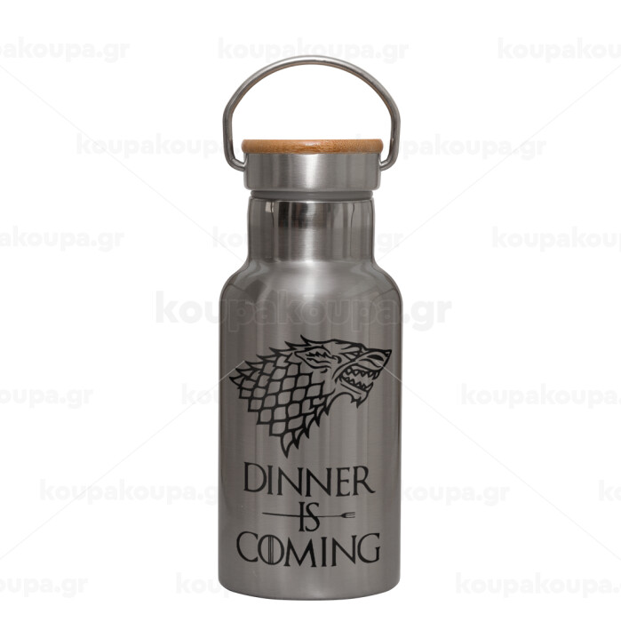 Dinner is coming (GOT), Stainless steel metallic thermos flask, silver with a bamboo lid, double-walled, 350ml.