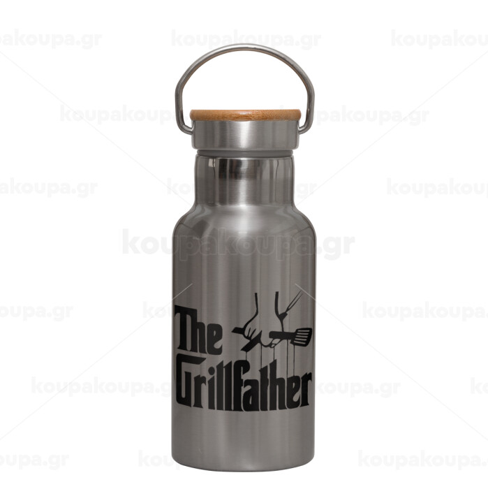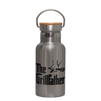 The Grillfather, Stainless steel metallic thermos flask, silver with a bamboo lid, double-walled, 350ml.