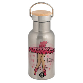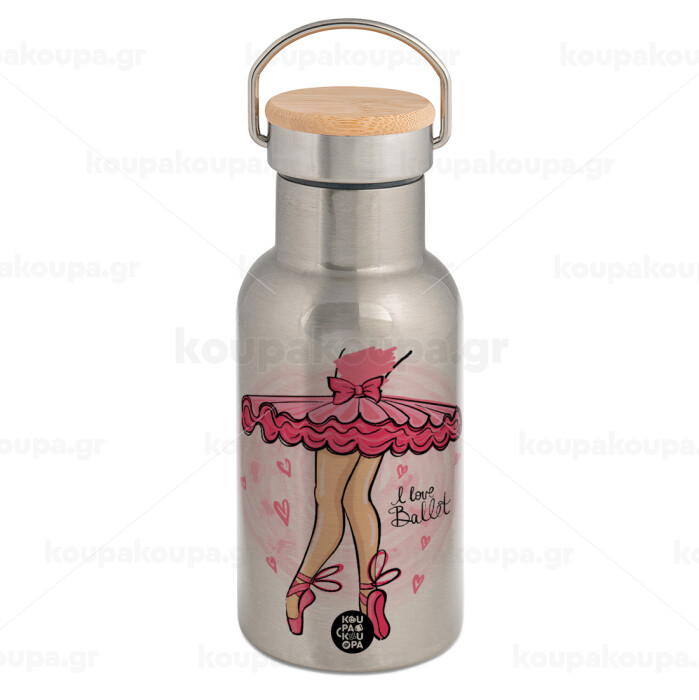 I Love Ballet, Stainless steel metallic thermos flask, silver with a bamboo lid, double-walled, 350ml.
