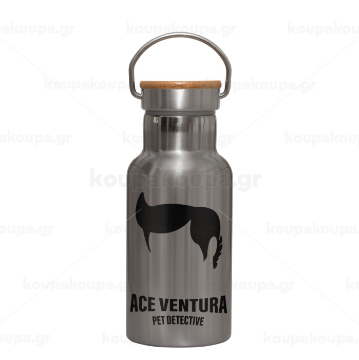 Ace Ventura Pet Detective, Stainless steel metallic thermos flask, silver with a bamboo lid, double-walled, 350ml.