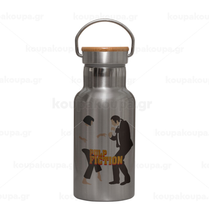 Pulp Fiction dancing, Stainless steel metallic thermos flask, silver with a bamboo lid, double-walled, 350ml.