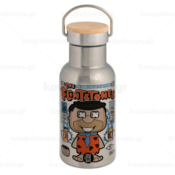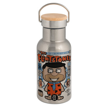 The flintstones, Stainless steel metallic thermos flask, silver with a bamboo lid, double-walled, 350ml.