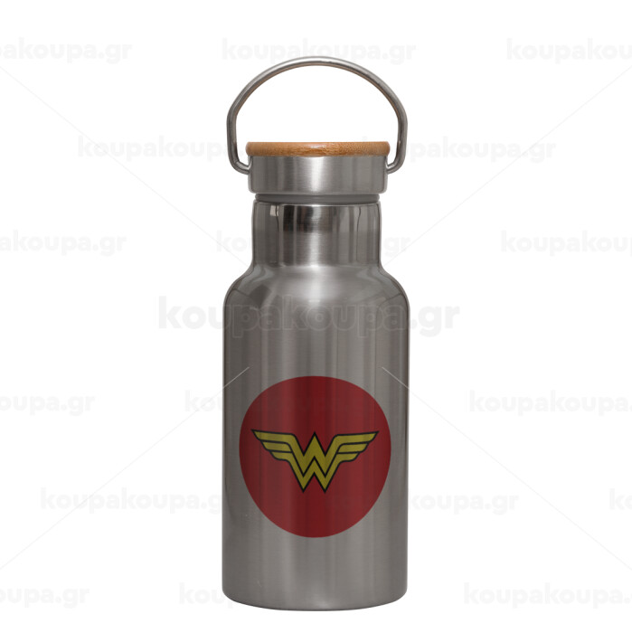 Wonder woman, Stainless steel metallic thermos flask, silver with a bamboo lid, double-walled, 350ml.