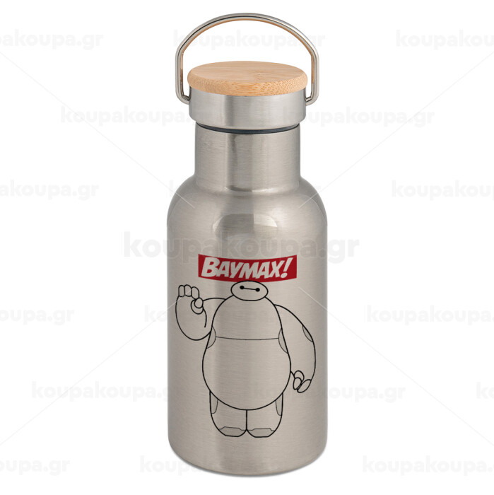 Baymax hi, Stainless steel metallic thermos flask, silver with a bamboo lid, double-walled, 350ml.