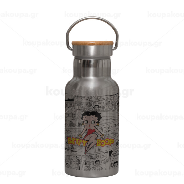 Betty Boop, Stainless steel metallic thermos flask, silver with a bamboo lid, double-walled, 350ml.
