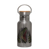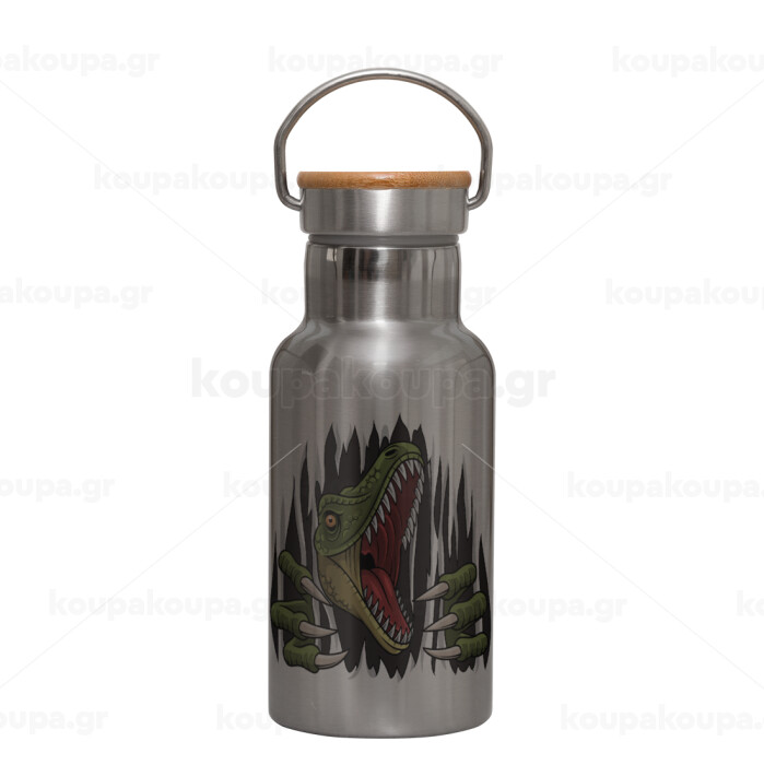 Dinosaur scratch, Stainless steel metallic thermos flask, silver with a bamboo lid, double-walled, 350ml.
