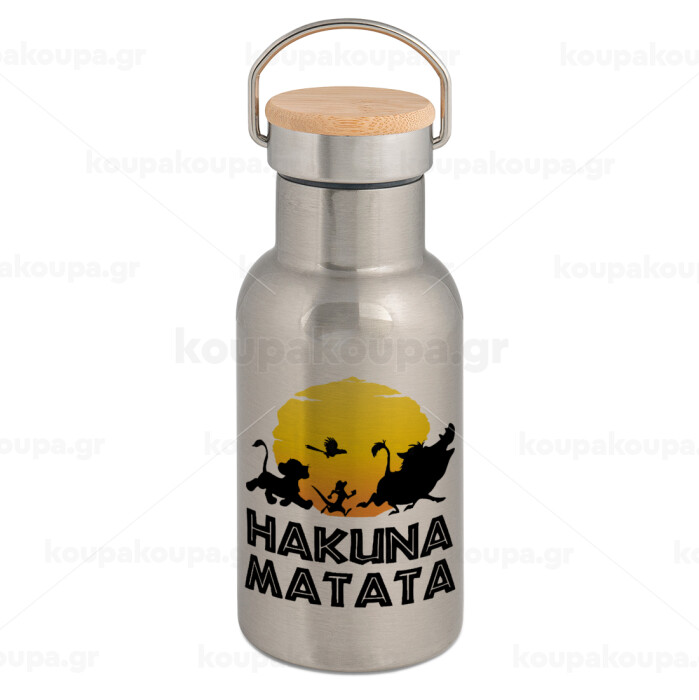 Hakuna Matata, Stainless steel metallic thermos flask, silver with a bamboo lid, double-walled, 350ml.