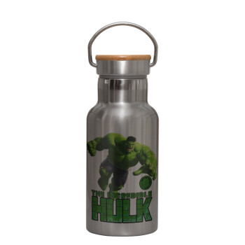 Hulk, Stainless steel metallic thermos flask, silver with a bamboo lid, double-walled, 350ml.