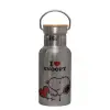 I LOVE SNOOPY, Stainless steel metallic thermos flask, silver with a bamboo lid, double-walled, 350ml.