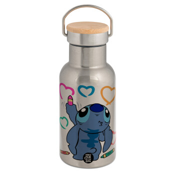 Lilo & Stitch painting, Stainless steel metallic thermos flask, silver with a bamboo lid, double-walled, 350ml.