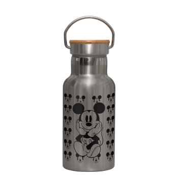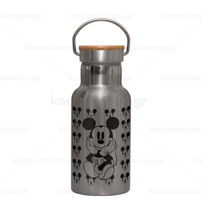 Mickey, Stainless steel metallic thermos flask, silver with a bamboo lid, double-walled, 350ml.