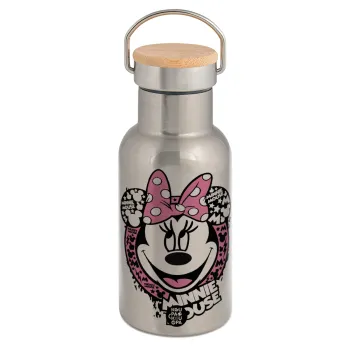 Minnie mouse, Stainless steel metallic thermos flask, silver with a bamboo lid, double-walled, 350ml.