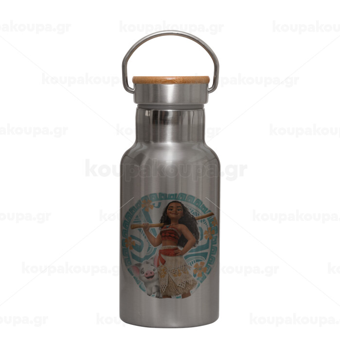 Moana, Stainless steel metallic thermos flask, silver with a bamboo lid, double-walled, 350ml.