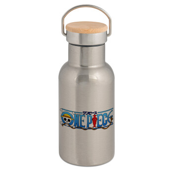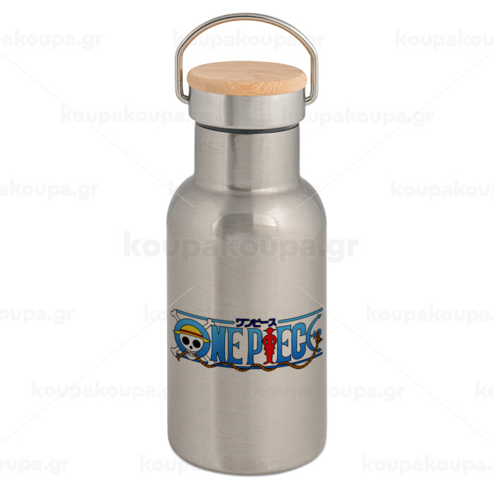 Onepiece logo, Stainless steel metallic thermos flask, silver with a bamboo lid, double-walled, 350ml.