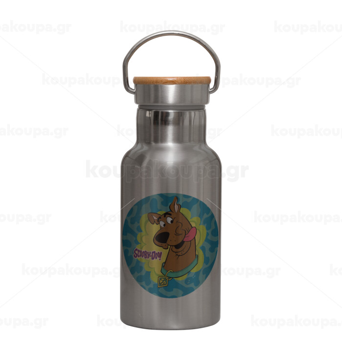 Scooby Doo, Stainless steel metallic thermos flask, silver with a bamboo lid, double-walled, 350ml.