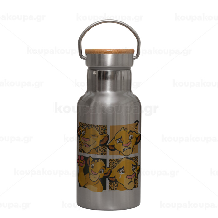 Simba, lion king, Stainless steel metallic thermos flask, silver with a bamboo lid, double-walled, 350ml.