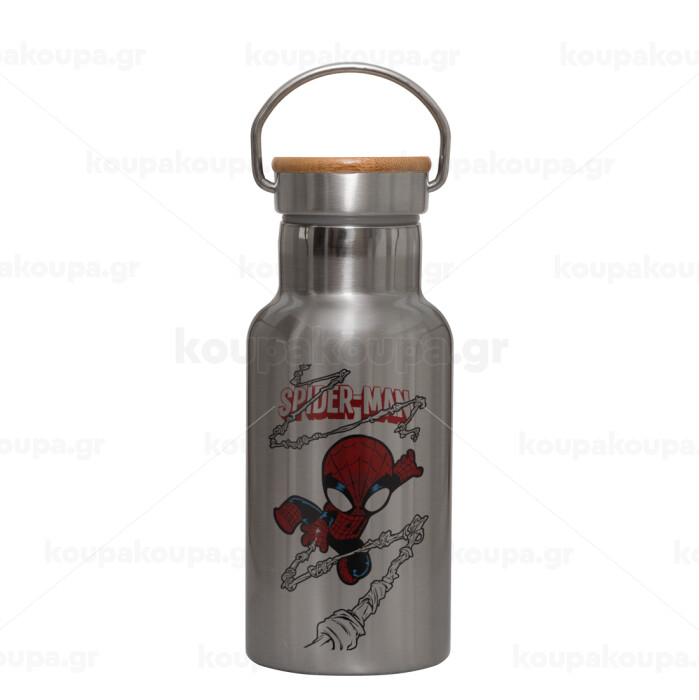 Spiderman kid, Stainless steel metallic thermos flask, silver with a bamboo lid, double-walled, 350ml.
