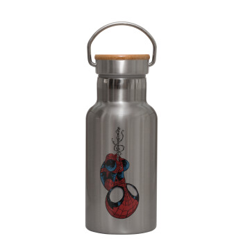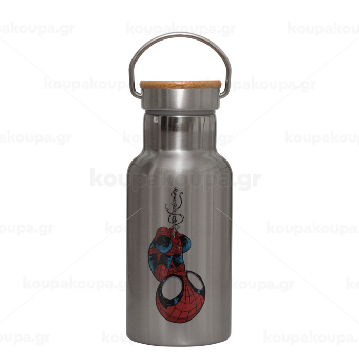 Spiderman upside down, Stainless steel metallic thermos flask, silver with a bamboo lid, double-walled, 350ml.