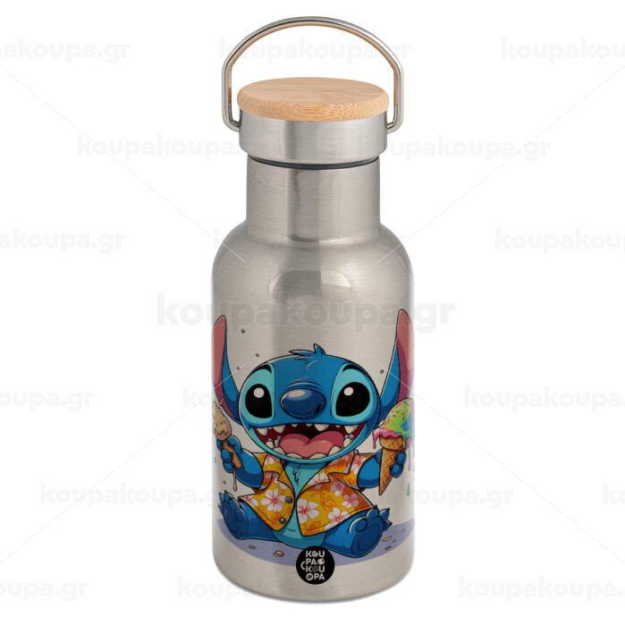 Stitch Ice cream, Stainless steel metallic thermos flask, silver with a bamboo lid, double-walled, 350ml.